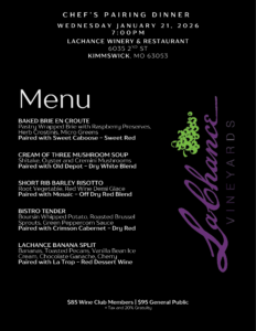 Join us for an intimate evening of exceptional food and thoughtfully paired wines at LaChance Winery & Restaurant. Our culinary team has crafted a five-course dining experience, with each course expertly paired with a LaChance wine to elevate every bite.